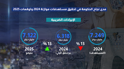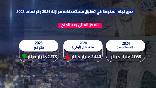 واستنادا لهذه التغيرات، ارتفع عجز الموازنة العامة 2.440 مليار دينار وفق الارقام الاولية للعام الحالي وباعلى من المستهدف، فيما توقعت انخفاض محدود في أرقام موازنة 2025.